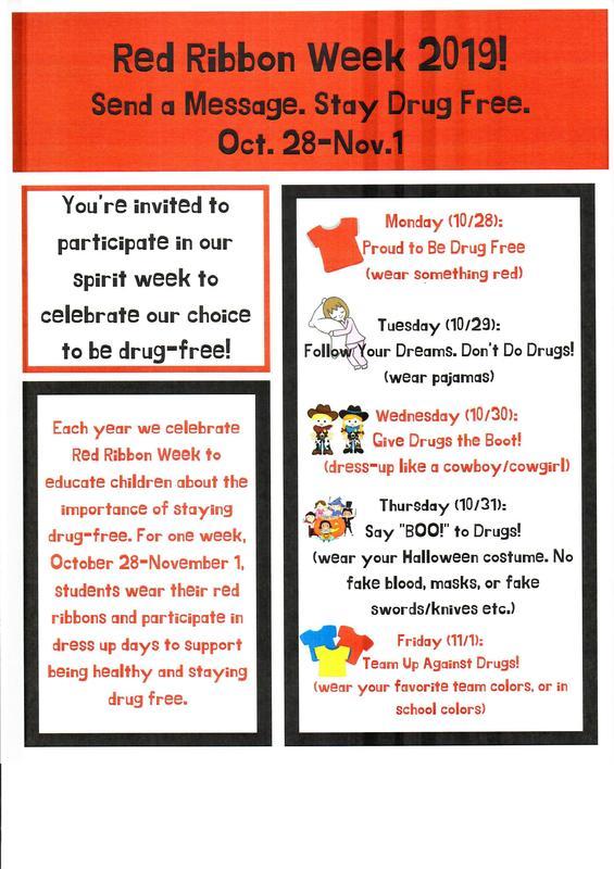 Please join us the week of October 28th in celebrating Red Ribbon Week in order to educate our children about the importance of staying drug-free!
